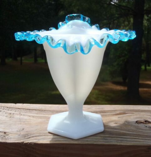 1940''s Fenton AQUA CREST Blue Edge Panel Milk Glass Jack in the Pulpit 6" VASE