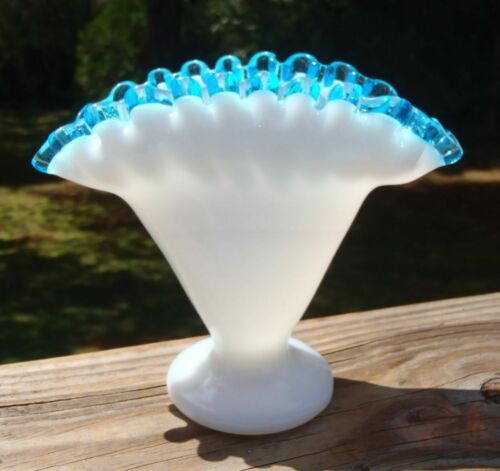 Title (ebay affiliate link): 1940''s Fenton AQUA CREST Blue Ruffled Crimped Edge Milk Glass 4.5" FAN VASE EC