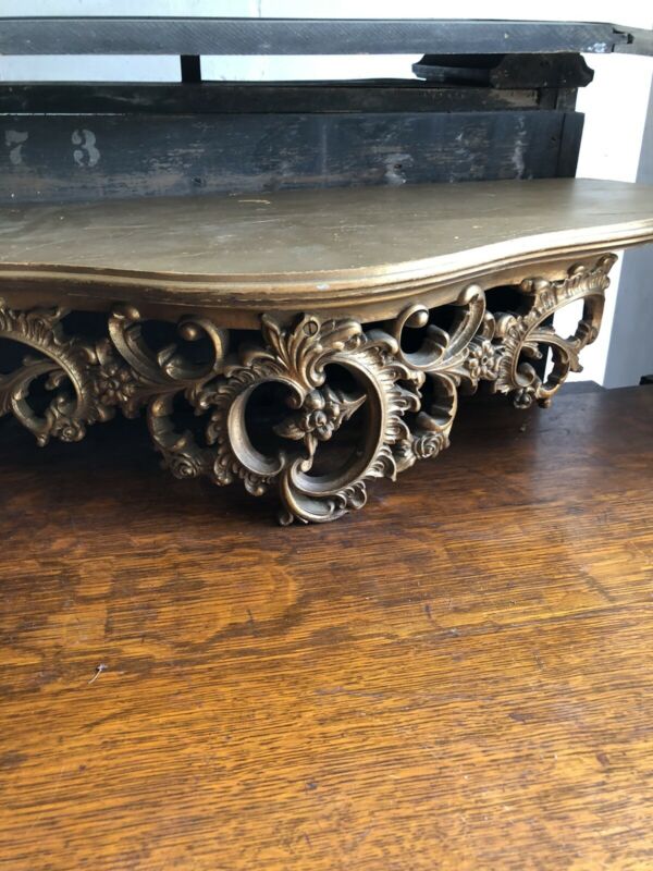 Title (ebay affiliate link): Vintage Gold Painted Syroco Wood Wall Shelf with Elaborate Shape and Design