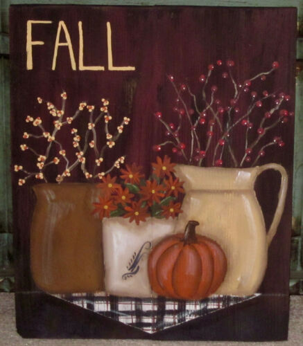 Title (ebay affiliate link): *~*PRIMITIVE*~* HP FOLK ART CROCKS * PUMPKIN * FALL * RECLAIMED WOOD