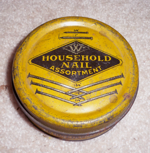 vintage 10 oz. HOUSEHOLD NAIL ASSORTMENT Tin hardware