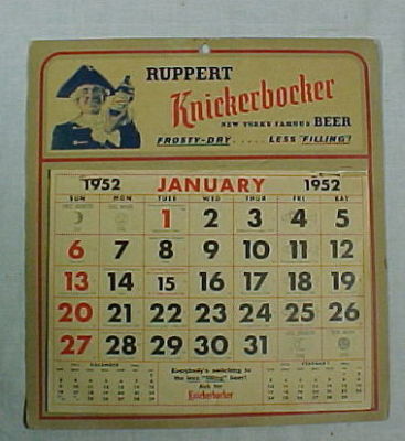 RUPPERT KNICKERBOCKER BEER 1952 CALENDAR COMPLETE NR