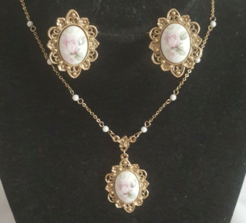 Title (ebay affiliate link): Vintage Gold Plate 1928 milk glass Flowers Pendant necklace & Earrings Set