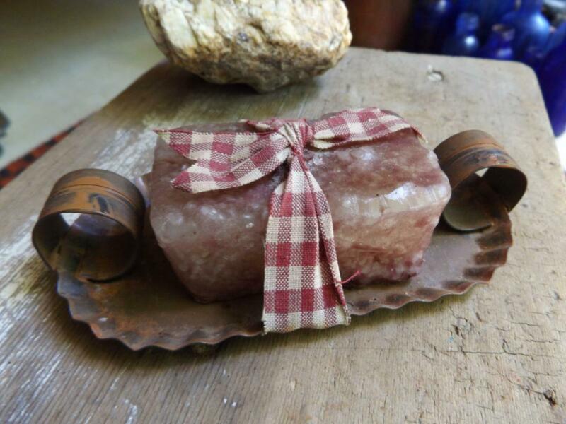 Title (ebay affiliate link): Small Primitive Tin Soap Dish With Rustic Hand Made Soap & Gingham Ribbon