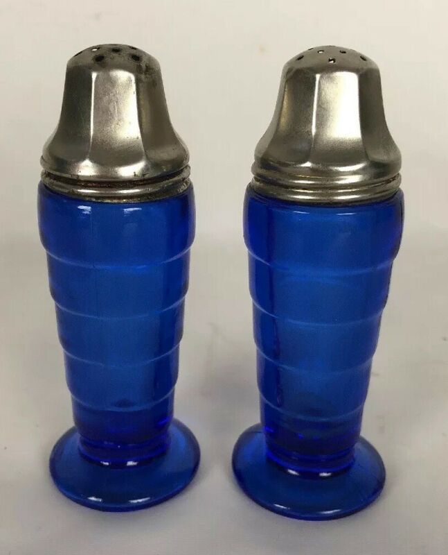 Title (ebay affiliate link): Vintage Moderntone Cobalt Blue Glass Salt Pepper Shakers Hazel Atlas 1934-1942
