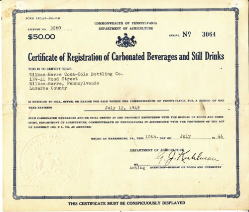 Title (ebay affiliate link): WILKES-BARRE COCA-COLA BOTTLING COMPANY CERTIFICATE OF REGISTRATION JULY 10,1944