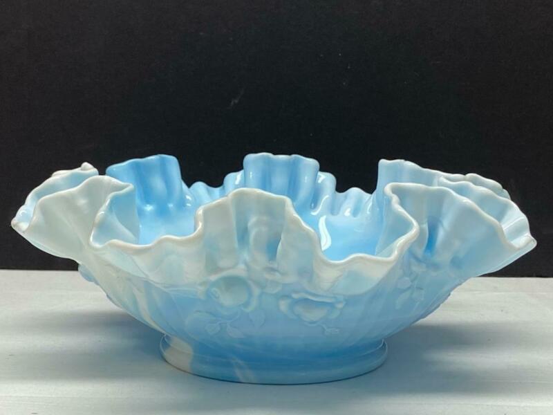 Vintage Fenton Blue Marbled Slag Milk Glass Ruffled Edge Bowl ~ Cabbage Rose