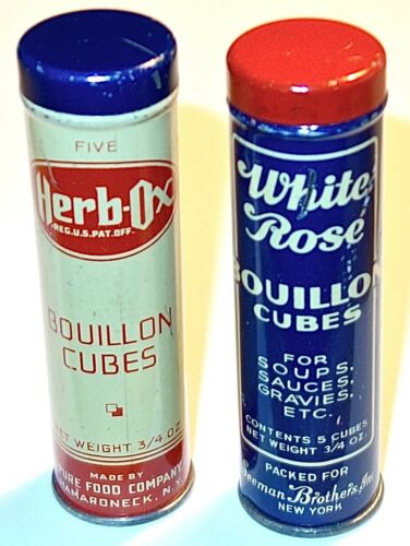 Title (ebay affiliate link): Vintage LOT of (2) HERB-OX & WHITE ROSE 3-1/2" BOUILLON CUBE Advertising TINS!