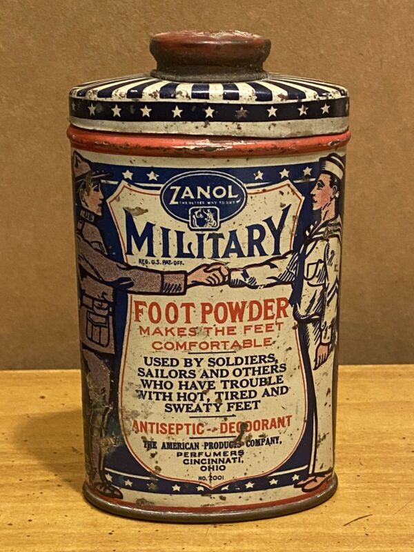 Title (ebay affiliate link): Vintage Zanol Military Foot Powder Tin Can World War I Era Soldier Sailor