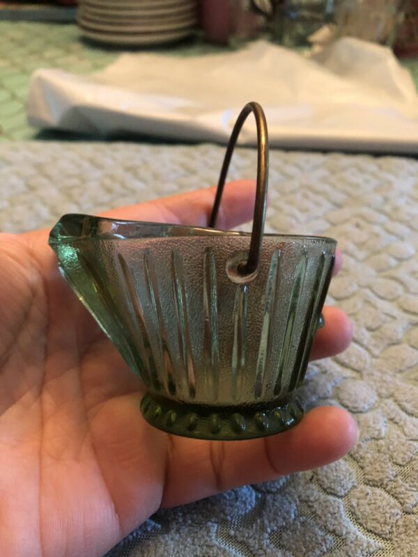 Title (ebay affiliate link): Green Depression Glass Mini Pitcher With Metal Handle