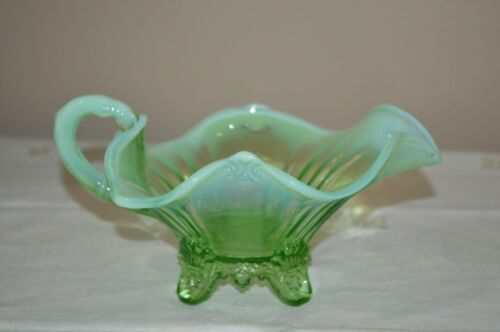 Title (ebay affiliate link): Vintage Green Vaseline Glass Ruffle Footed Bowl Serving Handled Plate