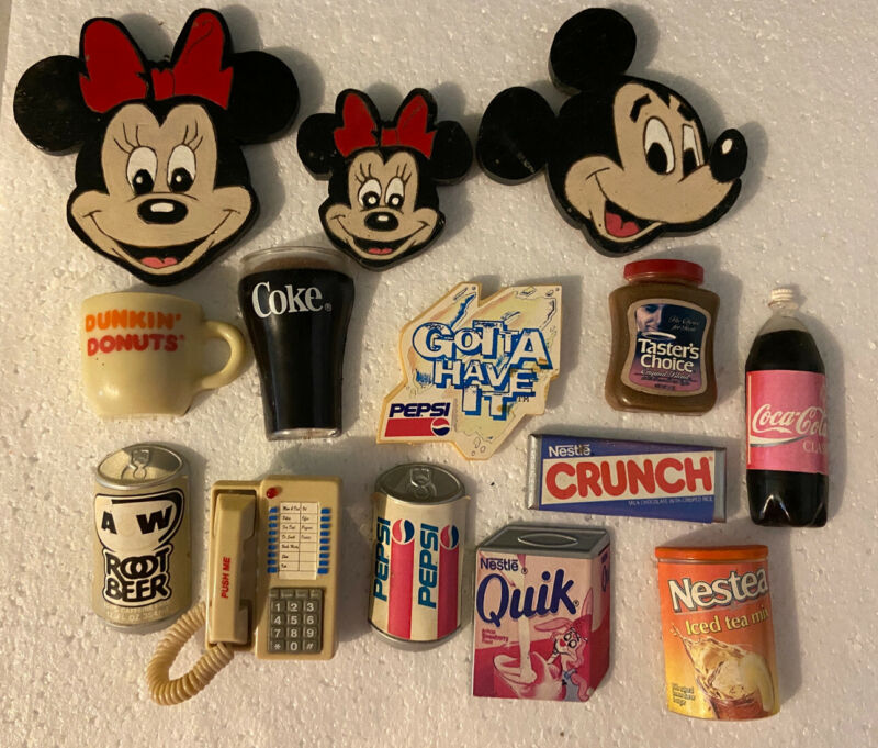 Title (ebay affiliate link): VINTAGE LOT of 15 Refrigerator MAGNETS Food Coke Pepsi Mickey Mouse Phone