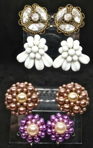 Vintage Screw Back Earrings Lot of 4 Pair: Elegant White Milk Glass 2 Cluster &