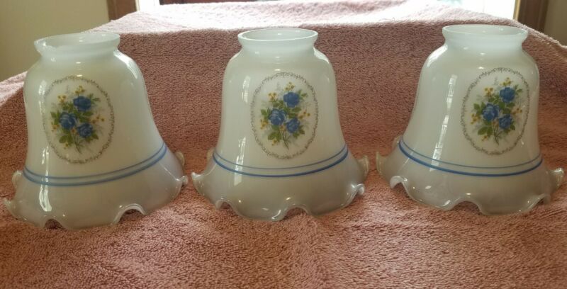 3 Vintage White Milk Glass Ruffled Blue Roses Ceiling Fan Light Shade 4 1/2"