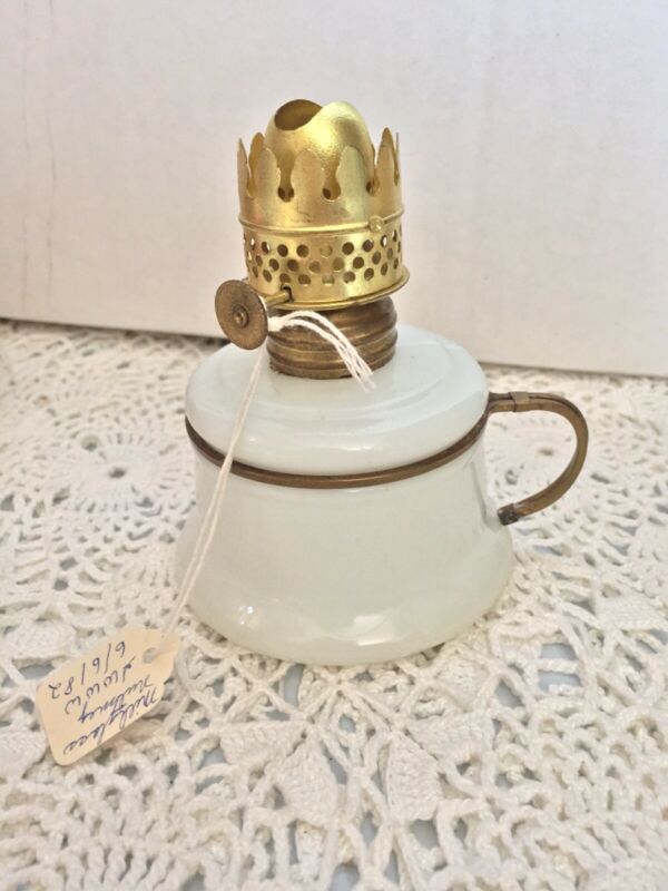 Title (ebay affiliate link): OLD SMALL 1890s MILK GLASS NUTMEG ANTIQUE MINIATURE FINGER OIL Base LAMP