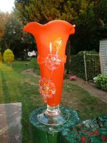 MURANO ART GLASS VASE SUNKIST ORANGE CASED MILK GLASS APPLIED GLASS FLOWERS