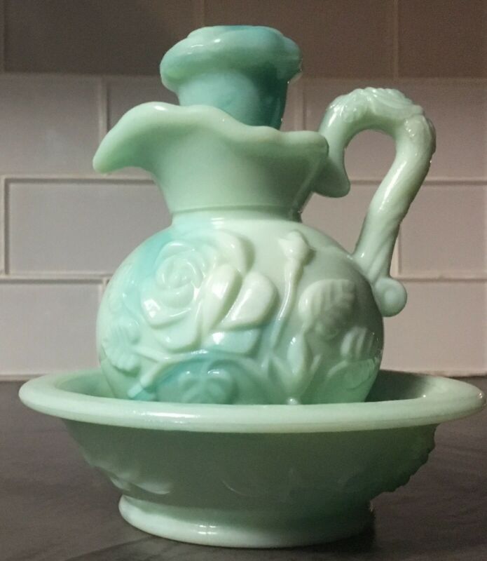 Title (ebay affiliate link): Milk Glass Avon Jade Teal Blue Swirl Decanter Pitcher with stopper FARMHOUSE EUC