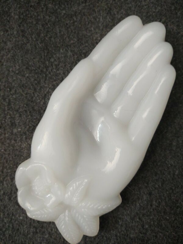 Old White Milk Glass Hand Rose Flower Wrist Dresser Vanity Pin Jewelry Dish Tray