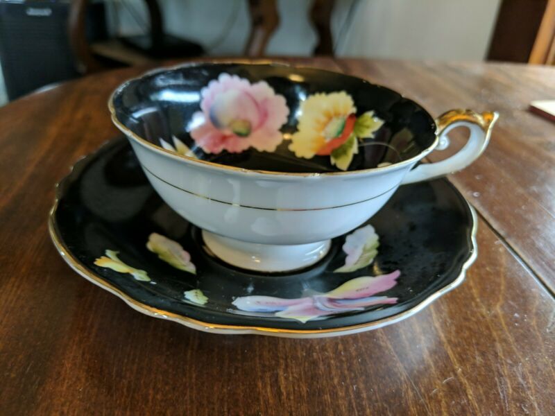 Title (ebay affiliate link): Vtg Elegant China Tea Cup & Saucer Black w/ Floral Design & Gold Trim