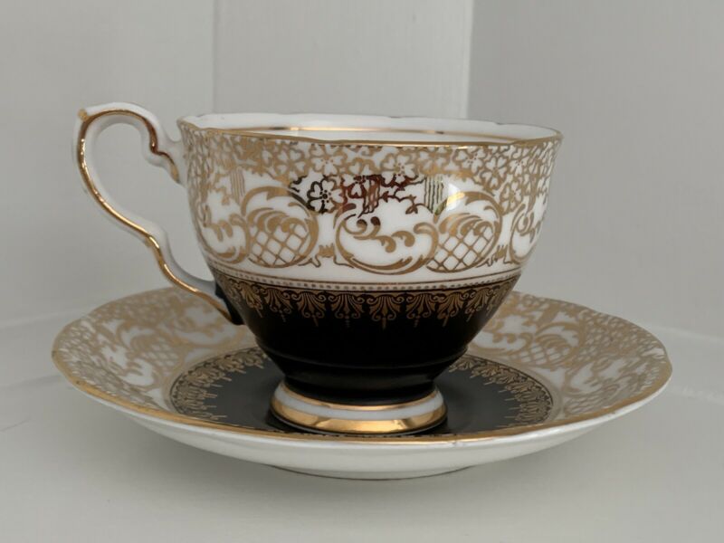 Vintage Royal Stafford Tea Cup and Saucer. Black, Creme and Elegant Gold