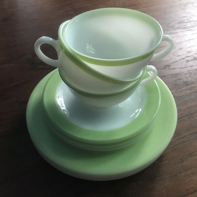 Vintage Lime Green And Milk Glass White Pyrex Tea Sets. 3-plates, Cups & Saucers