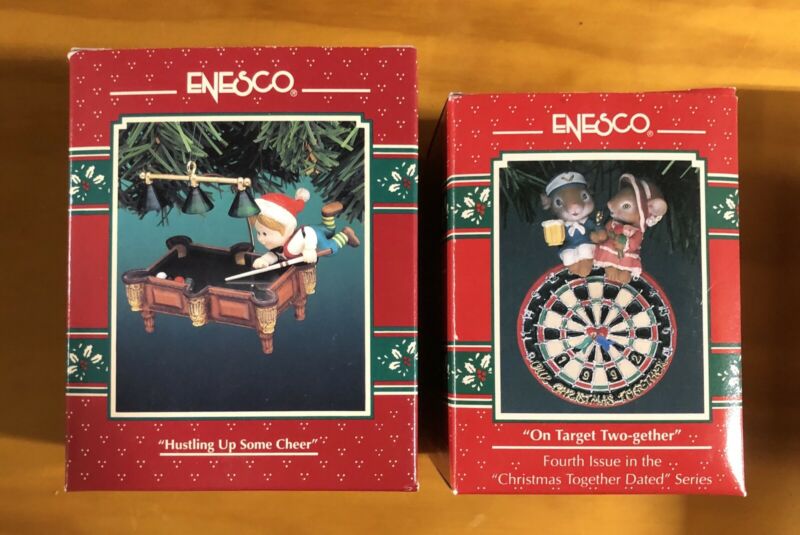 Title (ebay affiliate link): 2 - Enesco Christmas Ornaments - Game Room - Darts & Pool Table !!!!