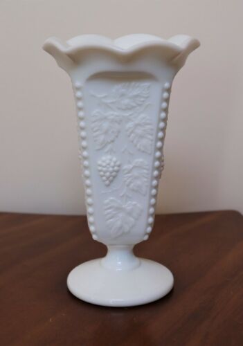 Title (ebay affiliate link): WESTMORELAND WHITE MILK GLASS PANELED GRAPE VASE WITH BEADS AND FLUTED TOP RIM