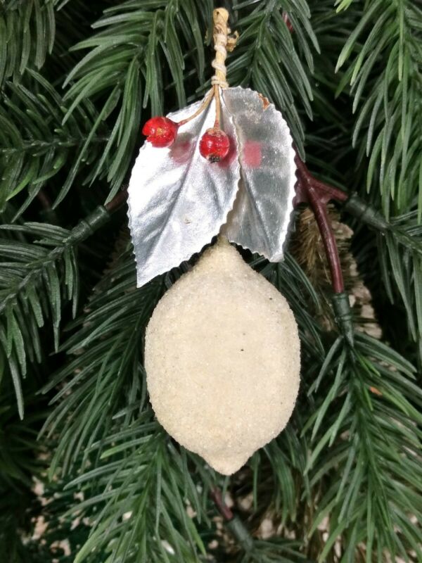 Title (ebay affiliate link): Antique 1930s FROSTED LEMON Art Deco SPUN COTTON Xmas Ornament Silver Leaves