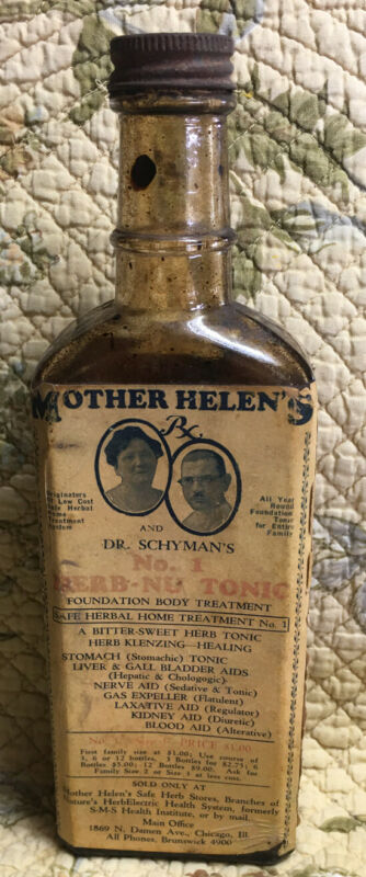 Title (ebay affiliate link): EARLY 1900 QUACK MEDICINE BOTTLE MOTHER HELEN''S & DR SCHYMAN''S No1 HERB-NU TONIC