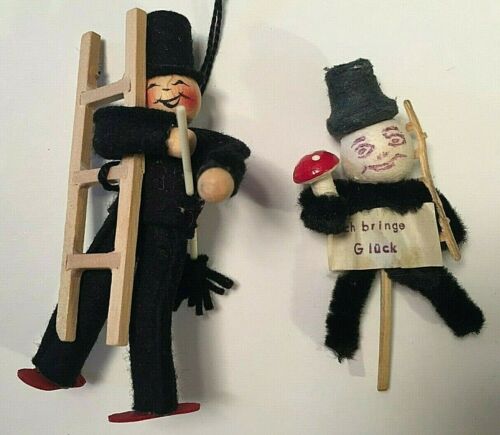 2 Vintage Chimney Sweep Christmas New Years Good Luck Ornament Putz Paper Mache