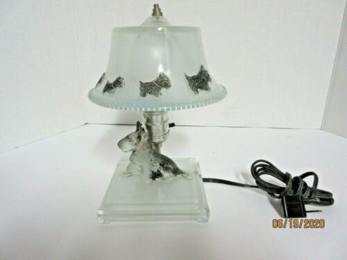 Title (ebay affiliate link): Antique Clear Glass Scotty Dog Lamp~Measures: 8 Inches High Beaded Shade~Unique