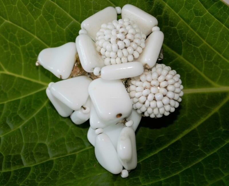 Title (ebay affiliate link): VINTAGE SIGNED MIRIAM HASKELL WHITE MILK GLASS FLOWER BROOCH PIN as is