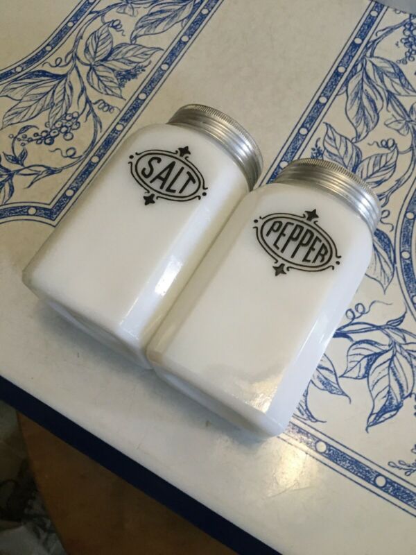 Title (ebay affiliate link): Vintage Milk Glass Salt Pepper Shakers Black Print Anchor Hocking Antique Old