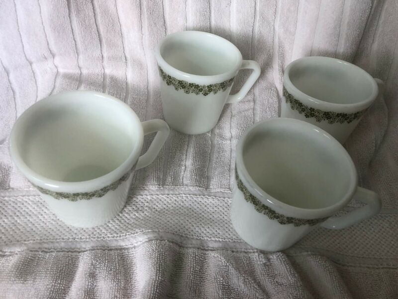 Title (ebay affiliate link): Vtg Pyrex Crazy Daisy Spring Blossom Milk Glass 4 Coffee Cups Mugs D Handle 1410