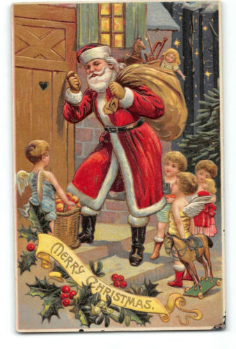 Christmas-Santa-Angels-Delivering Toys-Door-Horse-Doll-Embossed Antique Postcard