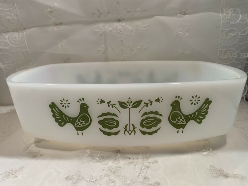 Vintage Federal Milk Glass Friendship Bird Casserole Loaf Pan Green Rooster USA
