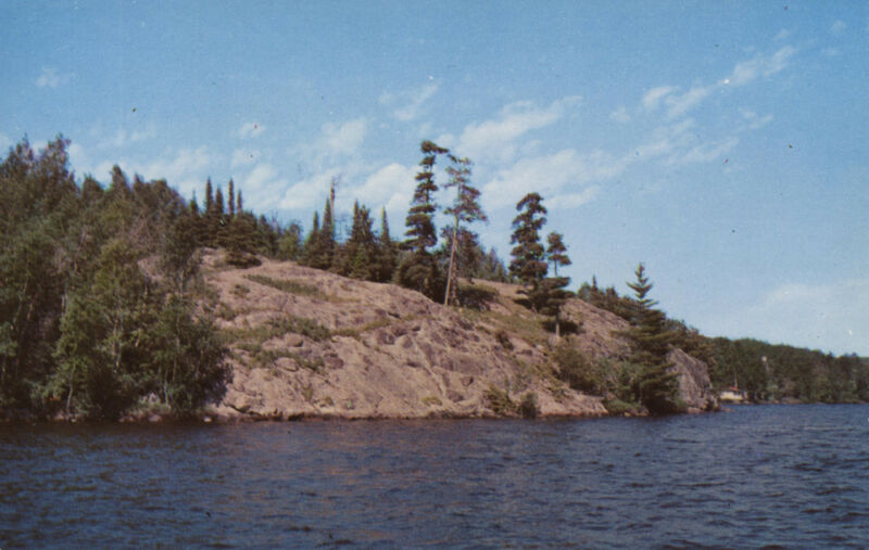 OLD POST CARD OF THE ROCKY SHORE OF A LAKE IN NORTHERN MINNESOTA