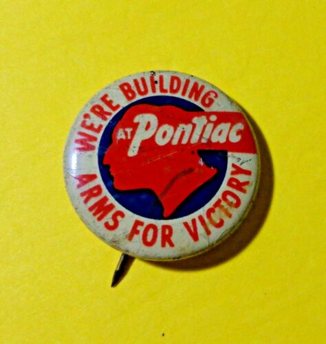 Title (ebay affiliate link): PONTIAC WERE BUILDING ARMS FOR VICTORY AT PONTIAC 1" PINBACK BUTTON