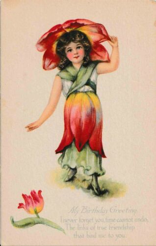Title (ebay affiliate link): Antique Fantasy Postcard Birthday Greetings Red Tulip Flower Girl M Dulk c1910