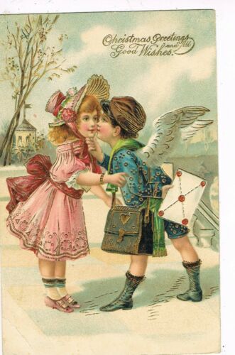 ANTIQUE EMBOSSED CHRISTMAS Postcard BOY KISSING GIRL, HOLDING CARD BEHIND BACK