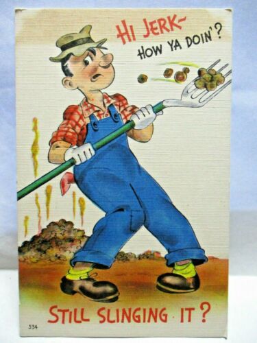 Title (ebay affiliate link): 1940s POSTCARD HI JERK HOW YA DOIN? STILL SLINGING IT? FARMER WITH MANURE