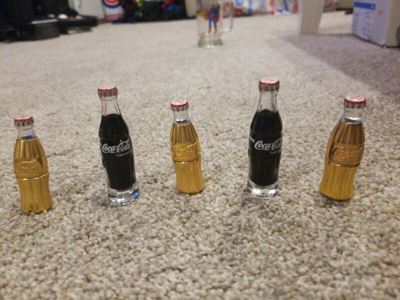Lot of 6 Vintage Mini coca cola gold Coke Bottles bottle cap lot 3 inches tall