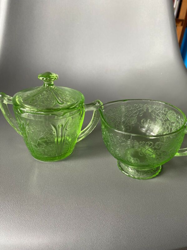 Title (ebay affiliate link): Green Hazel-Atlas Cherry Blossom and Florentine Cream and Sugar w/cover