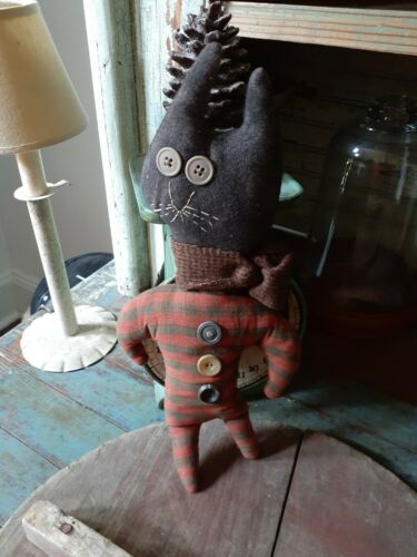 Cutiest PRIMITIVE handmade BLACK CAT doll in vintage fabric - preowned