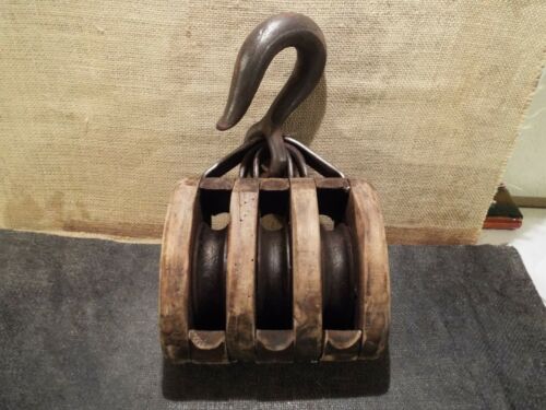 Title (ebay affiliate link): ANTIQUE NAUTICAL SAILBOAT WOODEN BLOCK w/ TRIPLE WHEEL PULLEY -Boston & Lockport