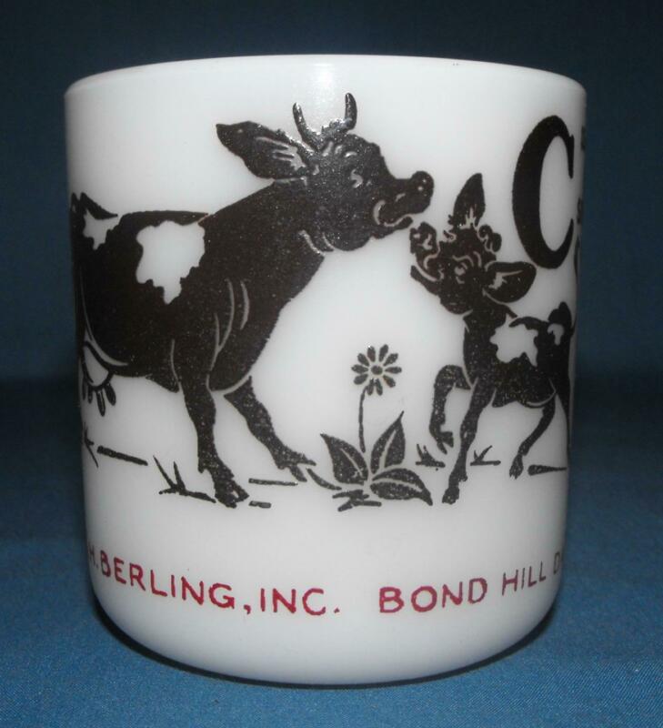 HAZEL ATLAS MILK GLASS ABC CHILDS CUP C IS FOR COW ADV BOND HILL DAIRY MAINE