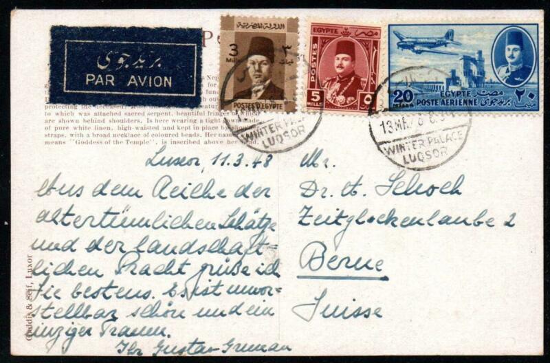Title (ebay affiliate link): SoD Egypt 1948 PPC (Cleopatra) sent airmail from LUQSOR WINTER PALACE to Berne