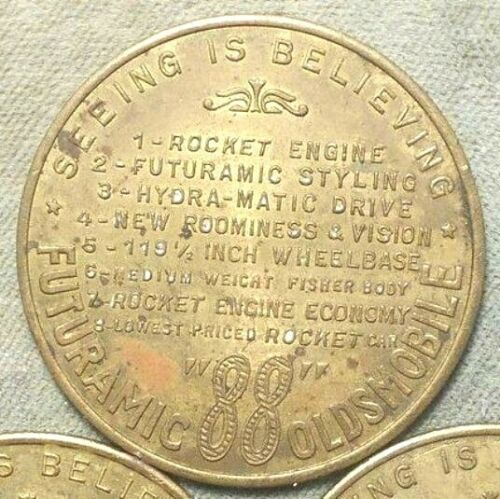 Title (ebay affiliate link): 1949-50 MEDAL TOKEN..OLDSMOBILE FUTURAMIC 88 - ROCKET POWER, SEEING IS BELIEVING