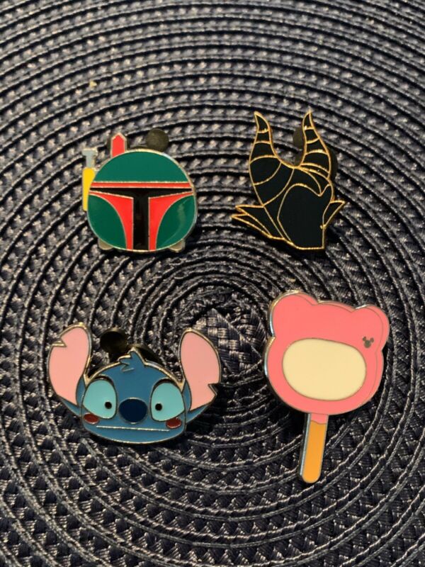 Title (ebay affiliate link): Disney 4 Pin Lot Stitch Bob Fett Emoji Maleficent Horns Lotso Cake Pop USED