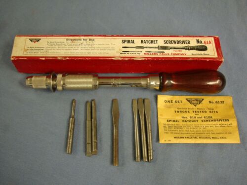Title (ebay affiliate link): Vintage Millers Falls No. 61A Spiral Ratchet Screwdriver, 7 bits w/sleeve, box.